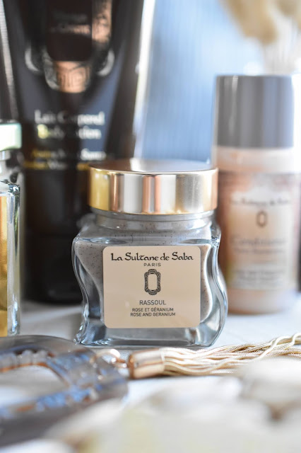 It is composed of a Amber Musk Sandalwood scented Body Lotion, a Cedar and Patchouli scented Gold Scrub, a Lotus and Frangipani Flower scented Conditioner, a Rose and Geranium scented Rassoul and the brand's Signature Necklace.