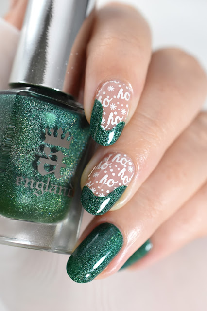 For this look, I used A England's gorgeous green holographic Mrs Dalloway* polish and a festive stamping with BeautyBigBang's XL-030 plate and Whats Up Nails' Blanc My Mind polish.